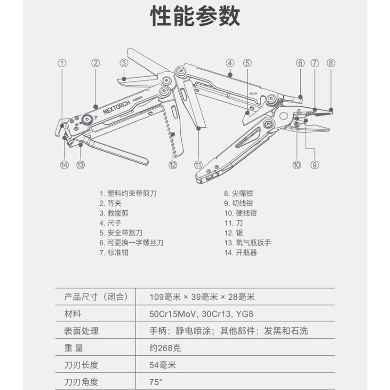 ●大鉗頭、大主刀、大鋸子、大塑料約束帶剪和安全帶割繩刀等多功能的整合