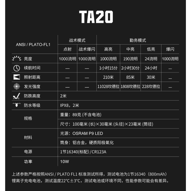 ●亮度:戰術模式:點射(1000流明);戰術爆閃(1000流明)