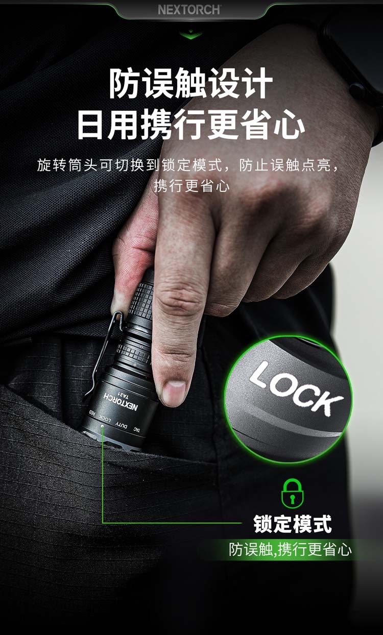 ●多模式組設計,旋轉筒頭可進行戰術-勤務-鎖定-紅光四種模式的切換,全能應對不同環境所需