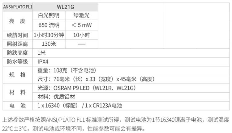 ●亮度:白光照明650流明/綠激光<5毫瓦